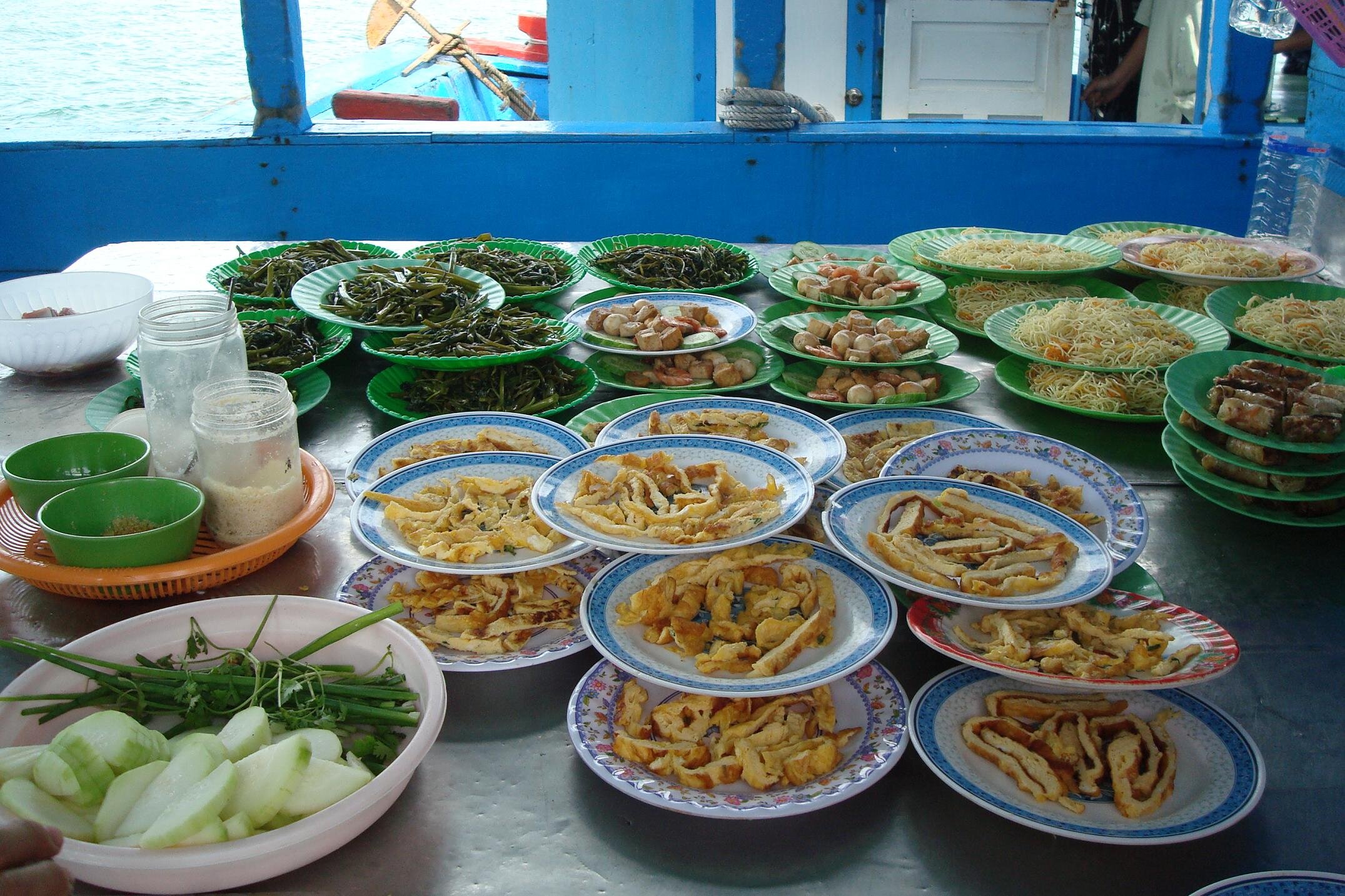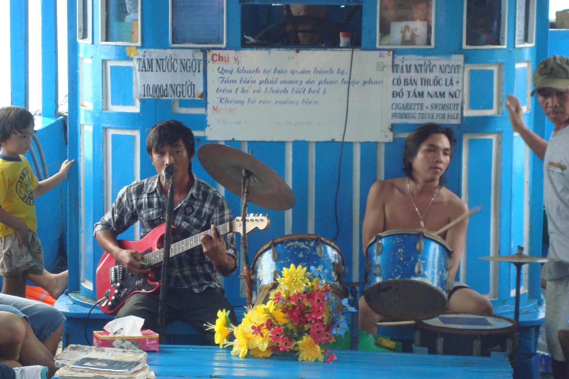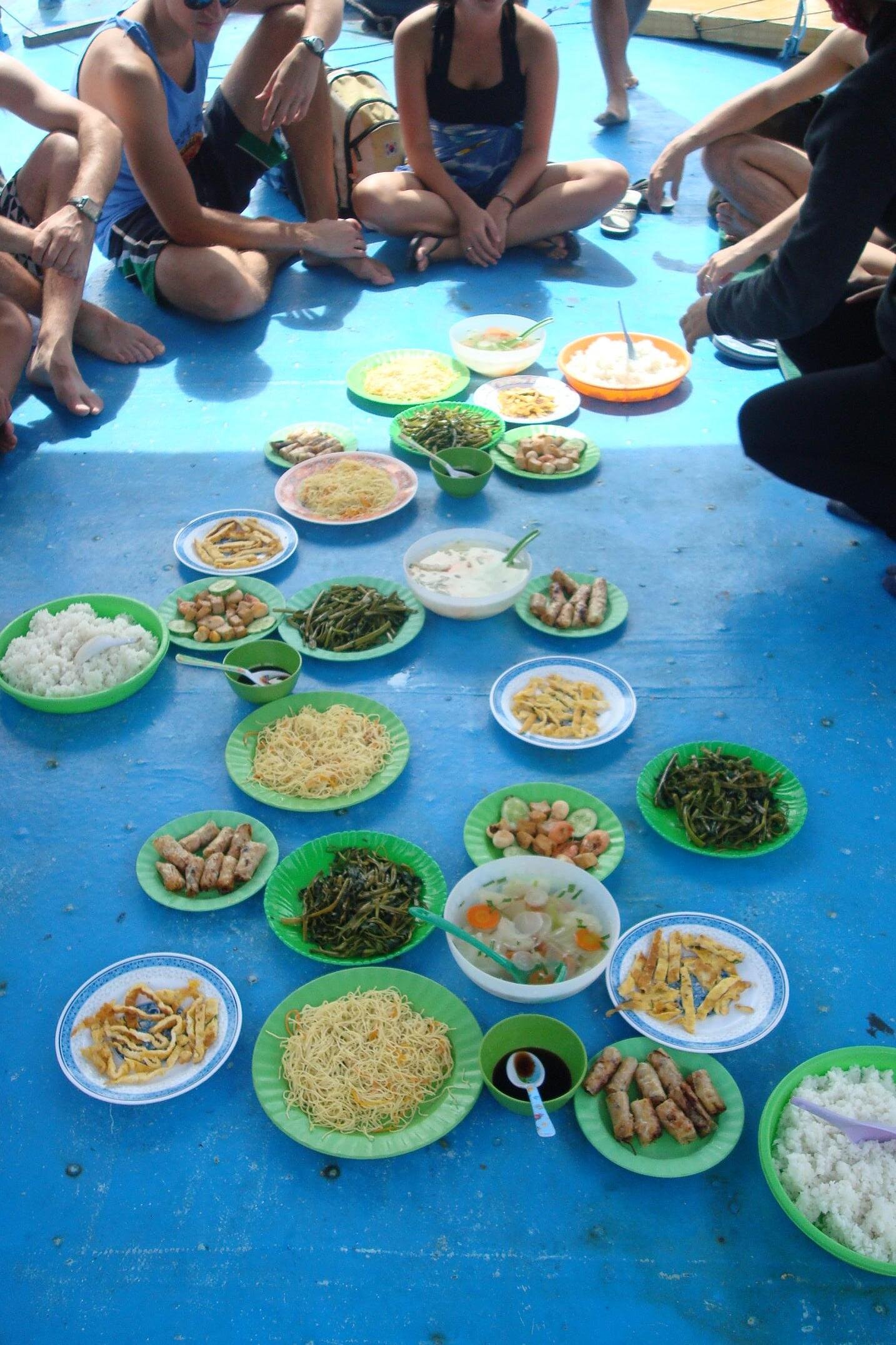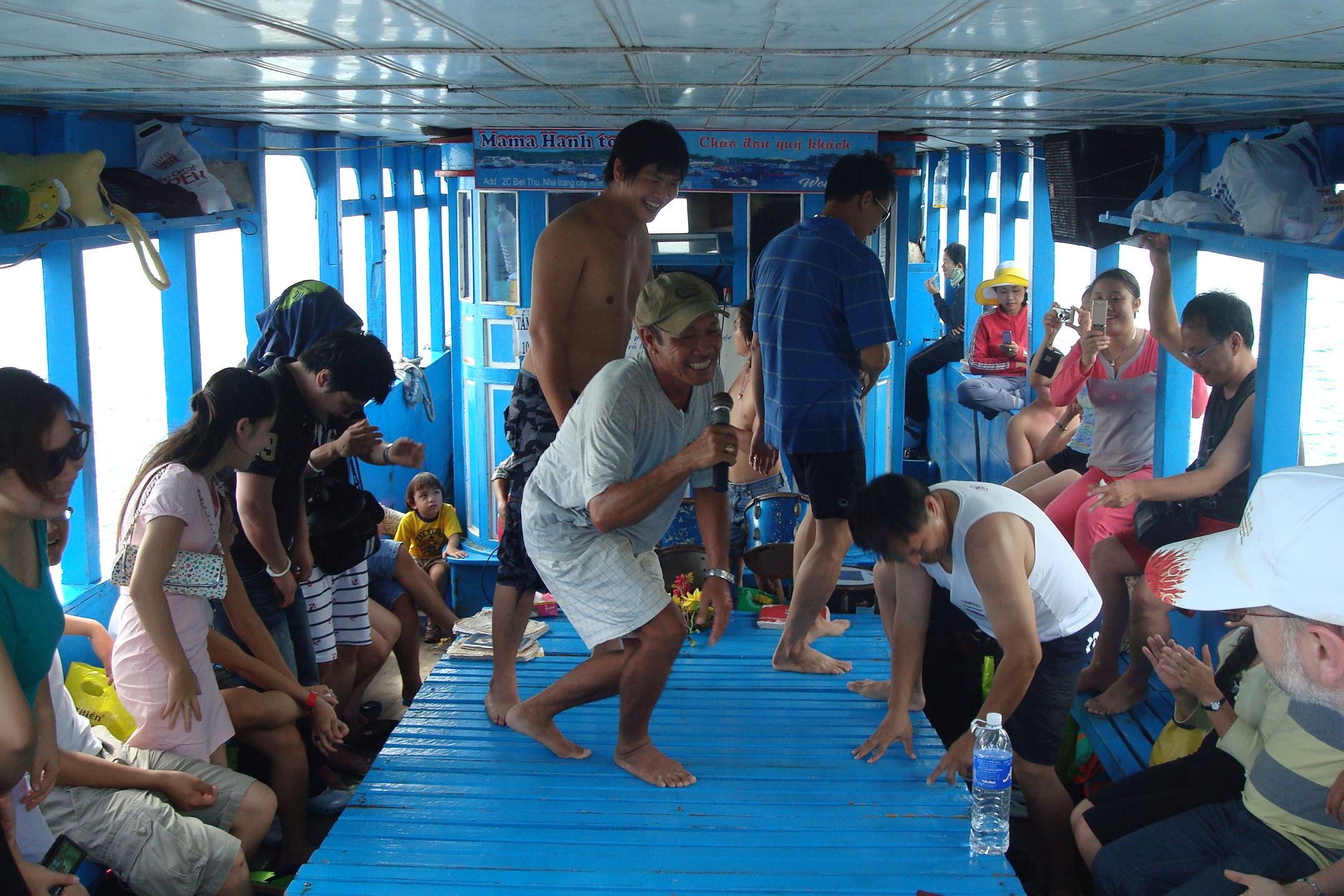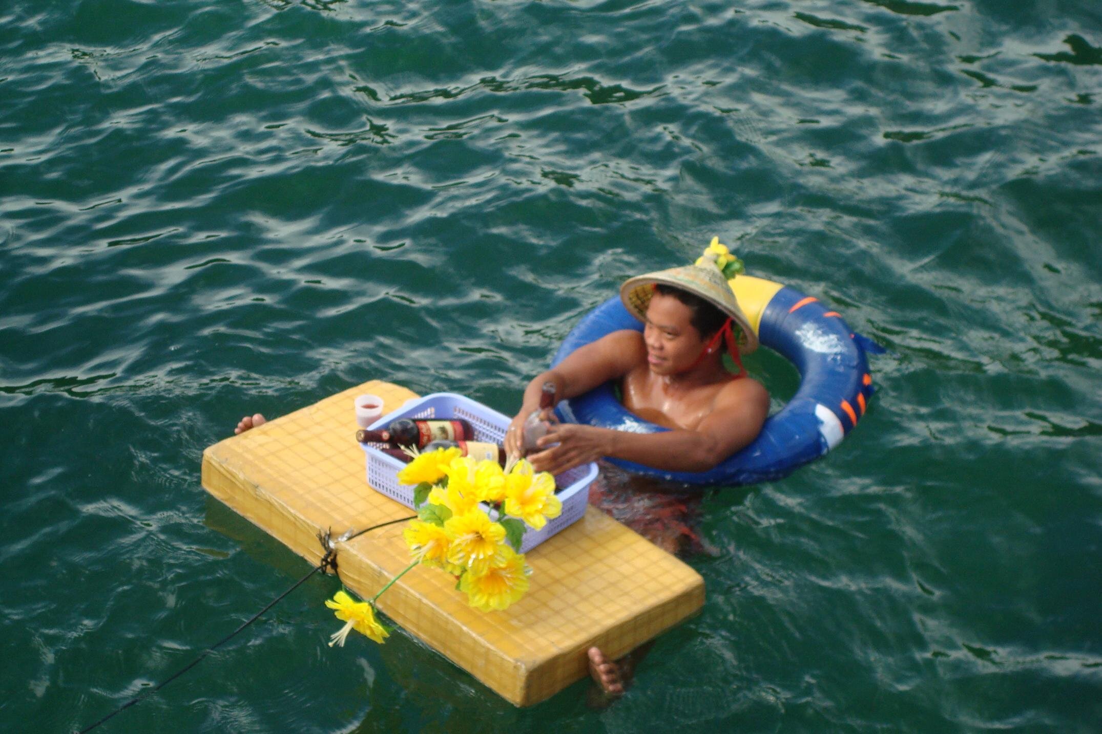 Plan byl napiety i nasz pan przewodnik zarzadzil koniec eksploracji dna i zbiorke. No i wtedy przyszla pora na czesc rozrywkowa. Podano nam na dachu lodki lunch: sajgonki, ryz, krewetki, kurczaki, jajka, warzywa, noodle, zupe. A gdy zakotwiczylismy sie w jakiejs przyjemnej zacisznej zatoce zaczelo sie na calego. Najpierw open bar w wodzie z lokalnym winem i owocami. Z glosnika na statku rozbrzmiewa 2unlimited, George Michael, Coco Jumbo. Rewelacja! :) mielismy godzine dla siebie. Plywanie, slonce, fikolki do wody z dachu lodzi, owocowe wino i 2 unlimited z glosnika...myslalam ze lepiej juz byc nie moze. Ale moze :) Patrze, a na lodzi z niewiadomo skad wylania sie perkusja i koles z gitara, a pan przewodnik porywa mnie to tanca. Cala lodka klaszcze, spiewa, chlopaki daja czadu na perksji, a ja wywijam z panem przewodnikiem. W nagorde dostalam bukiet sztucznych kwiatkow, ktory zreszta musialam zwrocic na koniec rejsu :) he he...tance poszly na calego. Tanczyli Chinczycy, Japonczycy, tanczyla Kanada, Anglia i Indoznezja. A potem kolejno byly spiewy i karaoke. Kazdy spiewal jak umial i w jakim jezyku potrafil, a zespol przygrywal po swojemu, czy to pod "gdzie strumyk plynie z wolna", czy to pod I will survive.