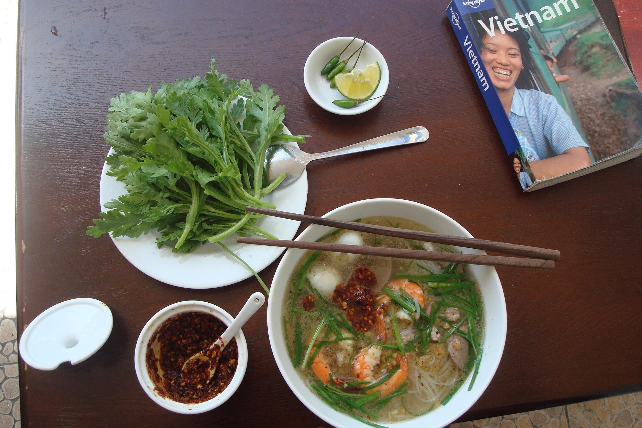 Z Jeanem pozeganalismy sie przed 8 bo w panice jechal ratowac oko. Fakt, nie wygladalo to za ciekawie i moj gil do pasa przy tym to pryszcz. Pogoda dzis w Da Lacie jak z zurnala. Niebieskie niebo, slonce i skwar. Jeszcze wczoraj byl plan na rowery, no ale z gilem i goraczka na rower to nie bardzo. Zostalo mi wiec miasto. W pierwszej trojce dalatowych atrakcji plasuje sie Crazy House, Pagoda Lam Ty Ni z mnichem artysta oraz dworzec kolejowy Da Latu z zabytkowa kolejka, ktora wiezie Cie do sasiedniej wsi Tria Mat - 8 km, przez okragle pol godziny. Zatem plan byl sprecyzowany. Przez lata wpajano mi,ze nic tak nie stawia na nogi w chorobie jak dobry rosol, czyli wietnamska pho. Ruszylam na spacer po miescie i gdzies w okolicach Truong Cong Dinh trafilam na chyba jedna z lepszych zup jakie jadlam, a jem je prawie codziennie wiec wiem co mowie. Zupa Hu Tiu Nam Vang za 22 000 dongs. Z krewetkami, chyba wolowina i przepiorczymi jajeczkami. No co to byl za kulinarny szal to nie do opowiedzenia.
