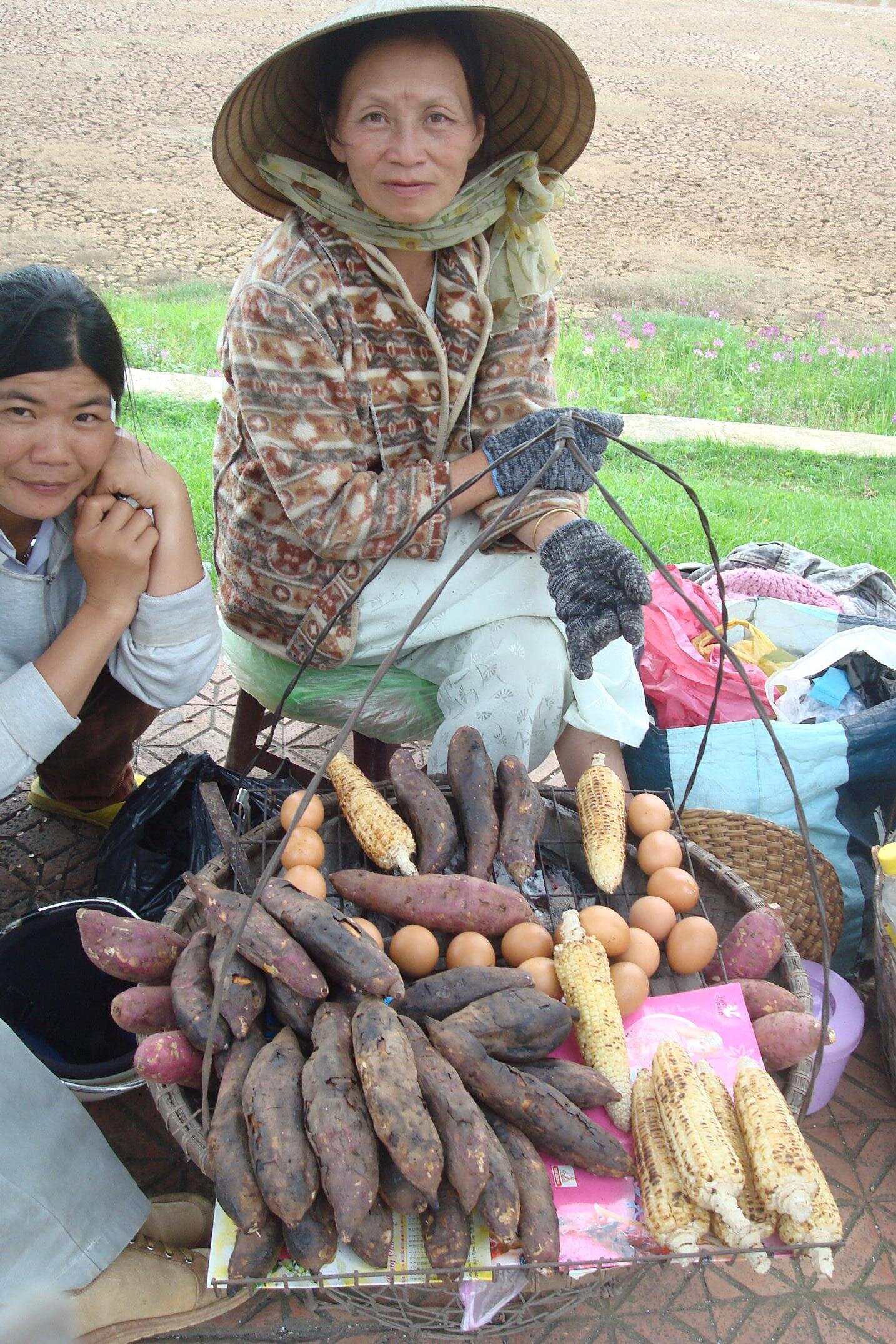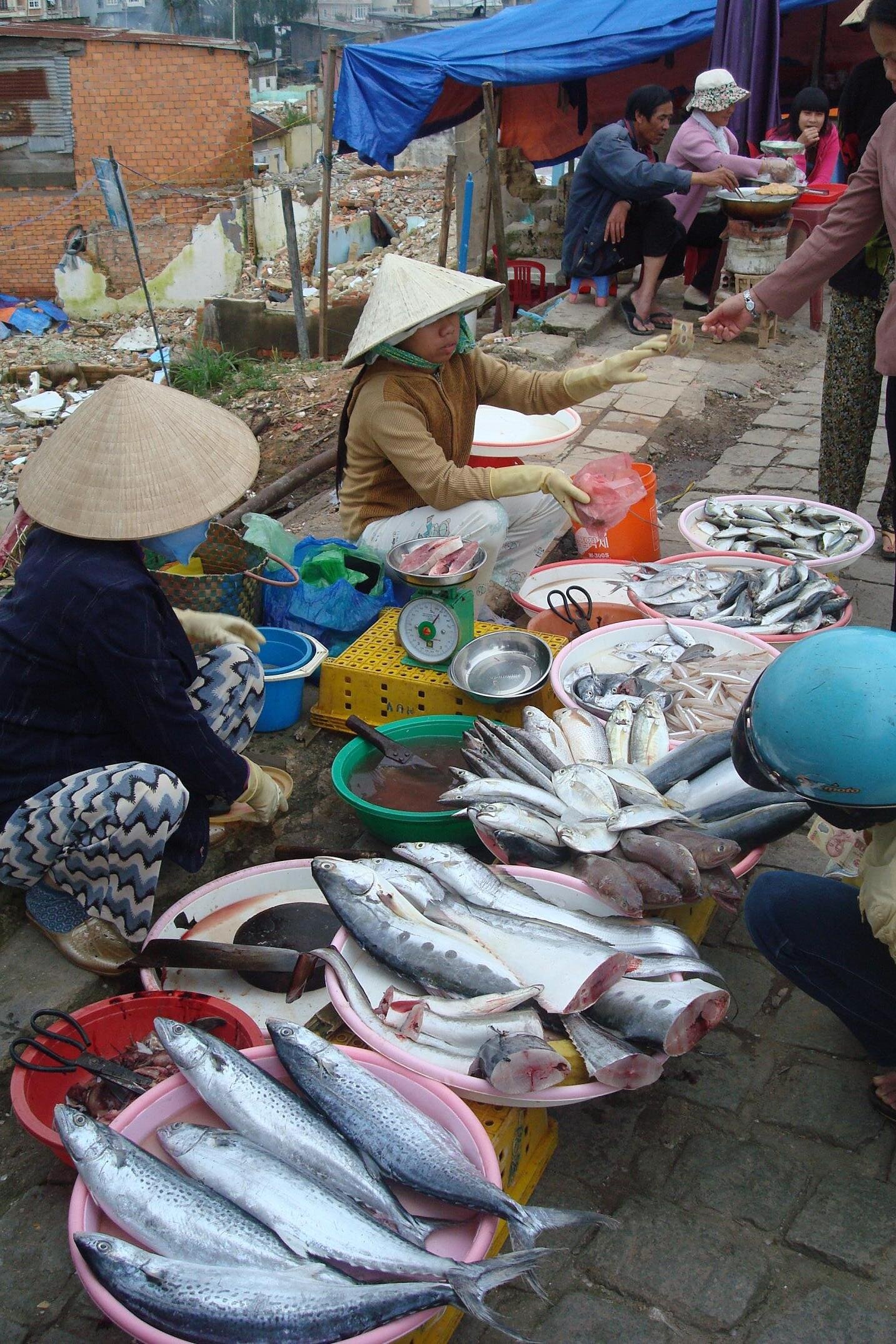 Na obiad dzis byly placki z krewetkami i to w pewnym stopniu robione samodzielnie (5000 dongsow sztuka). Lokalny bazar obfituje w takowe przysmaki. Siedze wiec na malym stoleczku, popijam herbate z szklanki wielkosci kieliszka do wodki i zawijam placki w ryzowy papier. Kolejnosc jest taka: najpierw papier moczy sie woda, potem uklada na nich salate, miete i inne zielone warzywa pochodne kapusty, potem wrzuca sie w to gotowego placka z farszem. Zawija. Macza w sosie rybnym i gotowe. Zabawa przednia, a efekt wyjatkowo smaczny.
