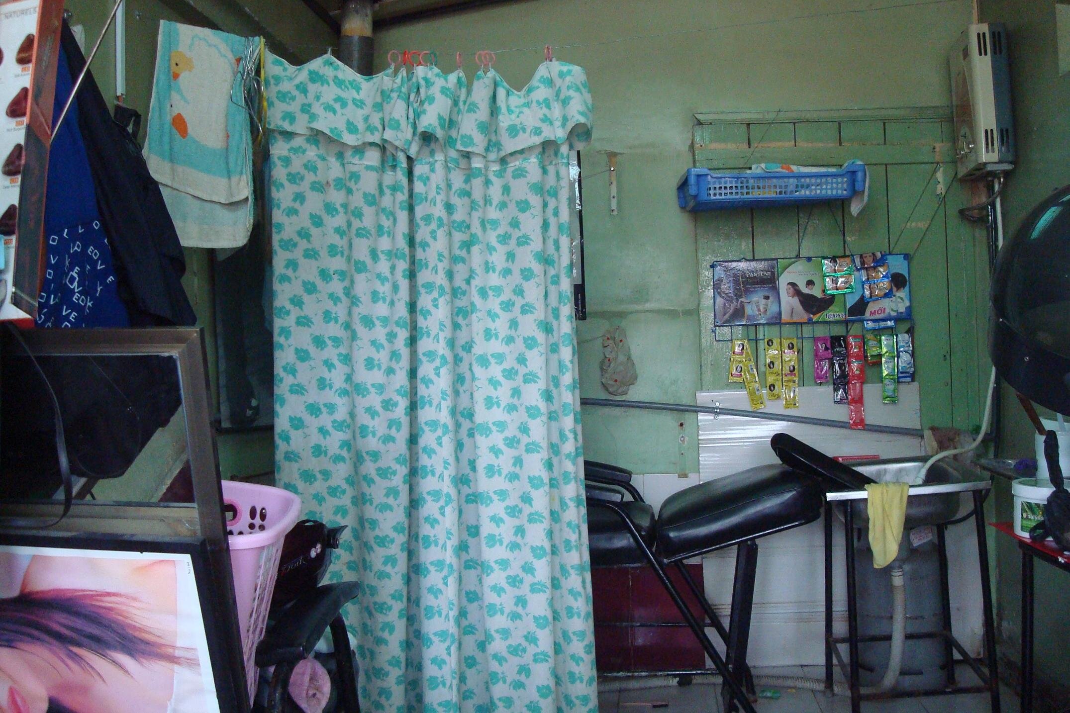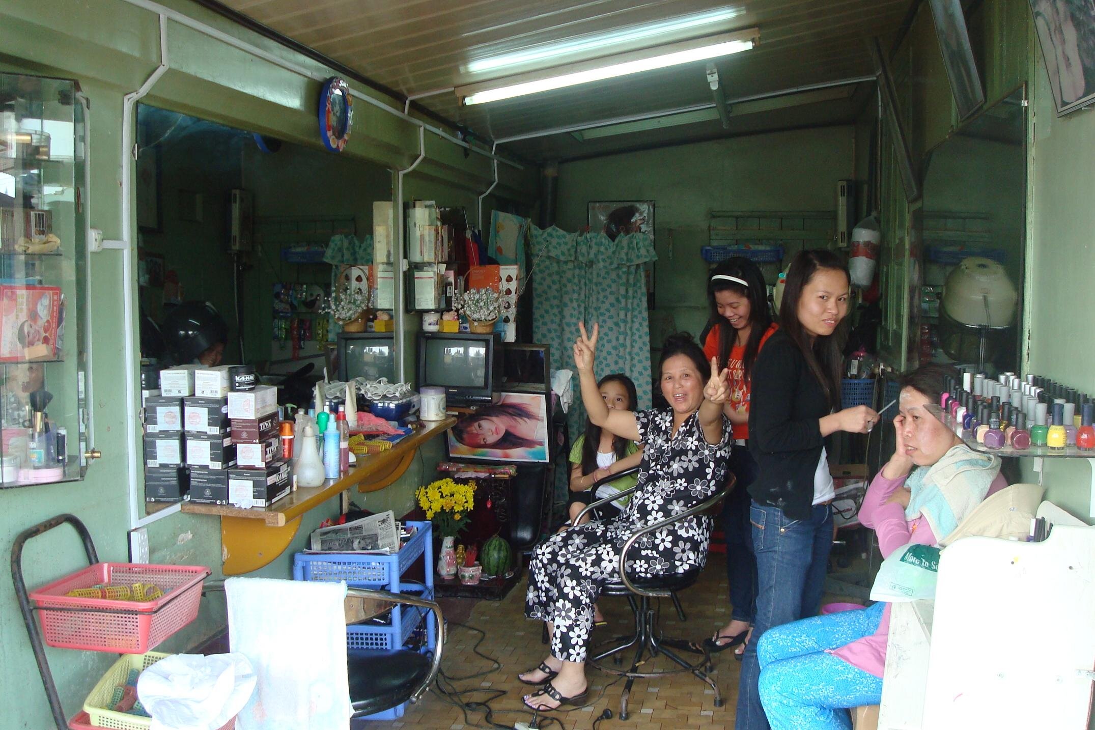 W napotkanym gdzies na srodku bazaru przy Anh Sang salonie fryzjerskim tlumy, wiec mysle sobie ze przeciez swiadczy to o jakiejs renomie. Wchodze. Chwila dezorientacji. I to nie mojej :) Oczywiscie nikt ani slowa po angielsku. No to wyciagam rozmowki wietnamskie. Jest o jedzeniu, jest o hotelu, jest wizyta u lekarza, ale nie ma ani slowa o fryzjerze. No nic, pokazuje w takim razie o co mi chodzi na migi. Myjemy, tniemy i po sprawie. Ale podpatrzylam jeszcze, ze salon oferuje rowniez i uslugi kosmetyczne. I tak: jedna Pani siedzi w rogu. Na calej twarzy rozsmarowali jej cos jak mydlo, a po chwili brzytwa wszystko usuwali...yyy..nieee... To chyba nie dla mnie. Za to w drugim rogu siedzi Pani na stoleczku, stopy ma w jakims garnku i robia jej pedicure. No i to byl strzal w dziesiatke. Decyduje sie zatem na zestaw fryzjer + pedicure.